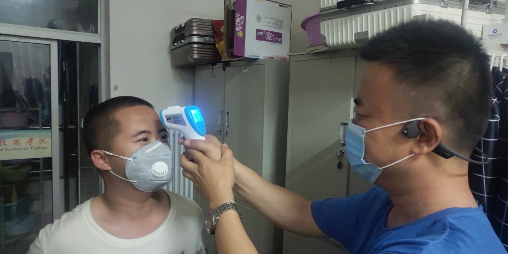陈旭铖为员工测量体温