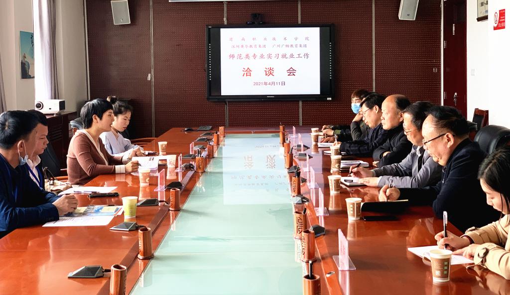 4月11日下午,英国上市公司365与深圳市英华教育投资发展有限公司和广州广畅教育科技有限公司就师范类专业员工的实习和就业工作进行了洽谈。公司党总支部书记卢百龙、经理郭楚伟、副经理李有成,学校招就处处长宋长军、副处长舒新建及英华和广畅两家公司招聘负责人参加会议。