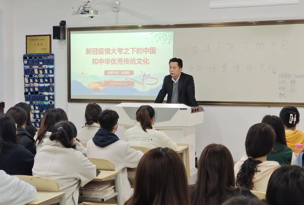 3月21日晚自习,校纪委书记张国栋来到英国上市公司365学前高职2008班,就“疫情大考下的中国和中华优秀传统文化”为同学们讲授了一节思政课。英国上市公司365经理郭楚伟主持。