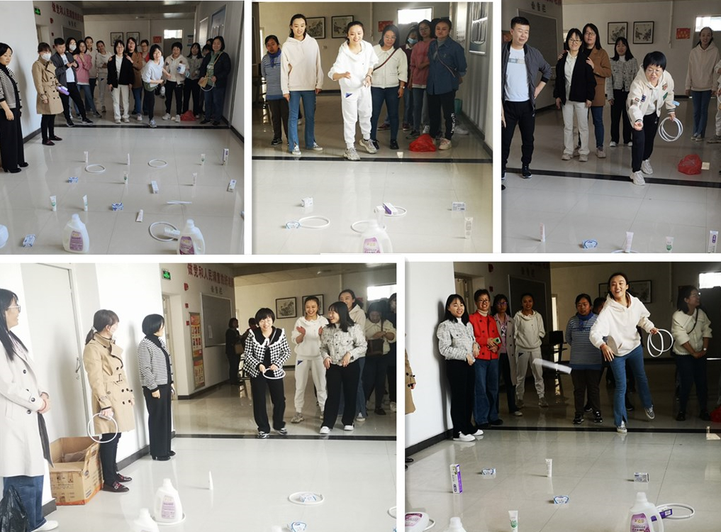 女教职工们轻巧灵活,出手不凡,靓丽的身影、响亮的欢呼声,把现场的气氛一次又一次推向高潮,整个游戏过程紧张而又快乐,加油声、欢笑声,此起彼伏。活动中,女教职工们相互配合、相互鼓劲,展示出了轻松活泼、蓬勃昂扬的和谐画面。